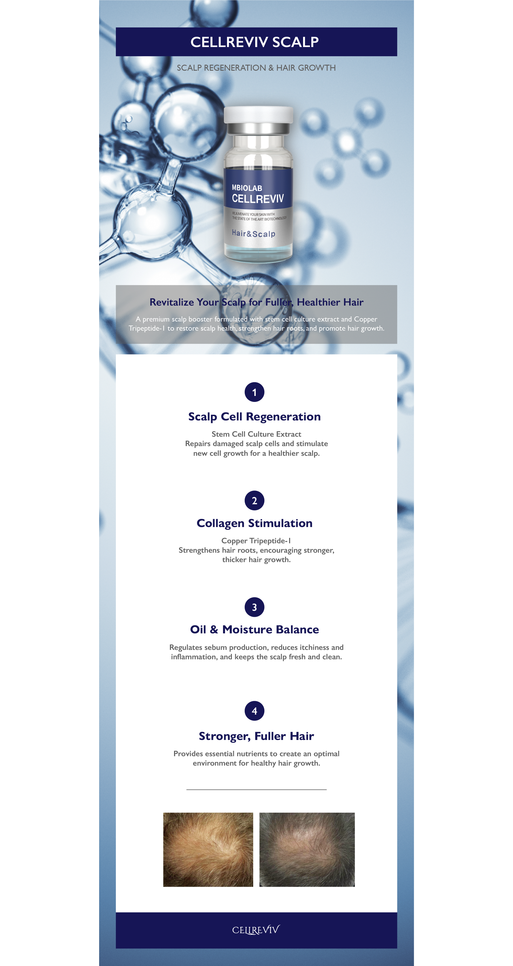 CELLREVIV SCLAP is a premium skin booster product designed to restore scalp health and promote hair growth. Its unique formula combines stem cell culture extract and Copper Tripeptide-1 to regenerate scalp cells and strengthen hair roots, resulting in fuller and healthier hair.