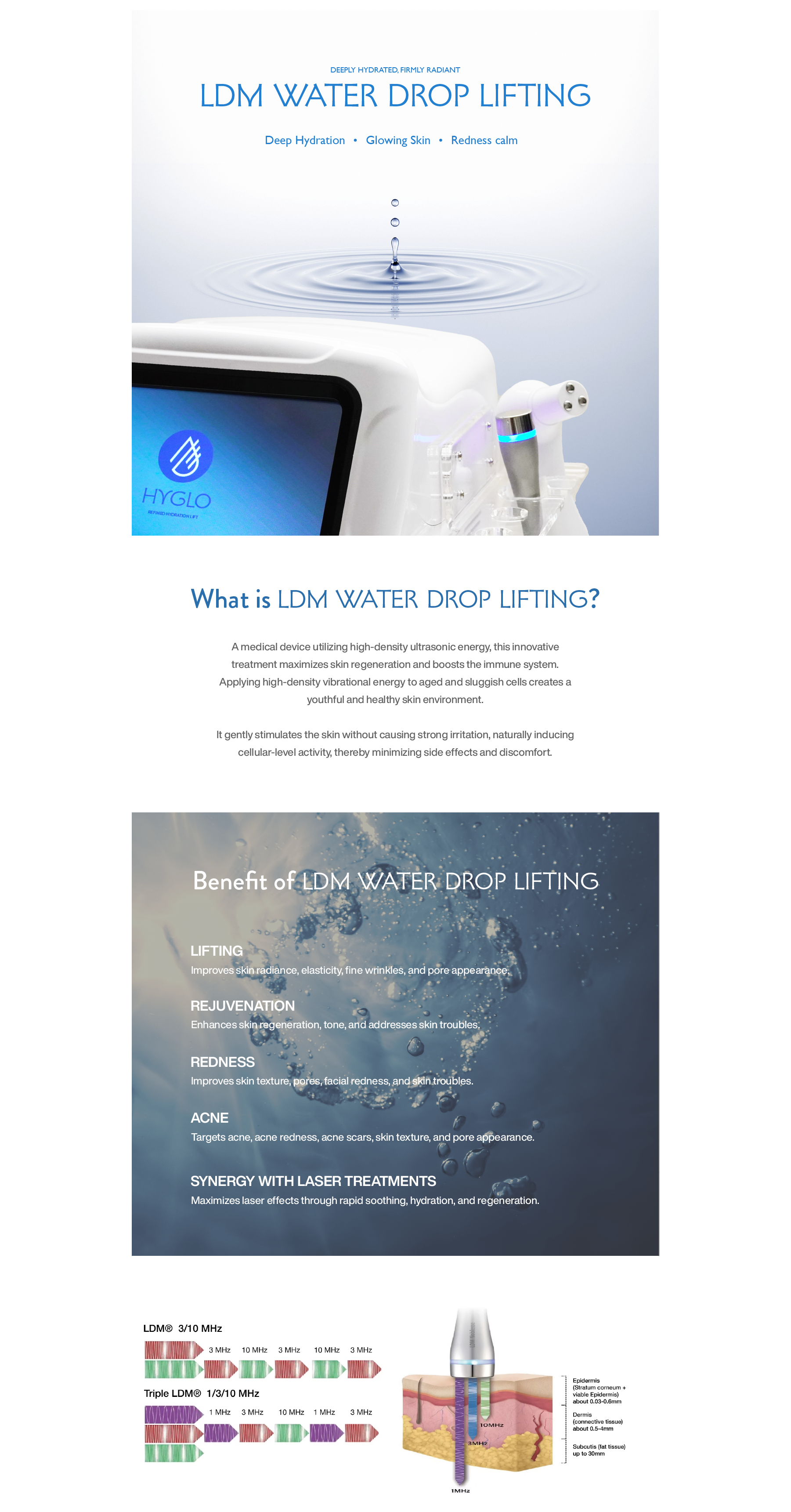 LDM (Localized Dynamic Micro-wave) Water Drop Lifting is an innovative technology that maximizes the stimulation of skin regeneration and the immune system.